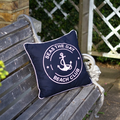 Stiilne, sinise-valge kirjadega, mereteemaline pehme padi, suuruses 40 x 40 cm.