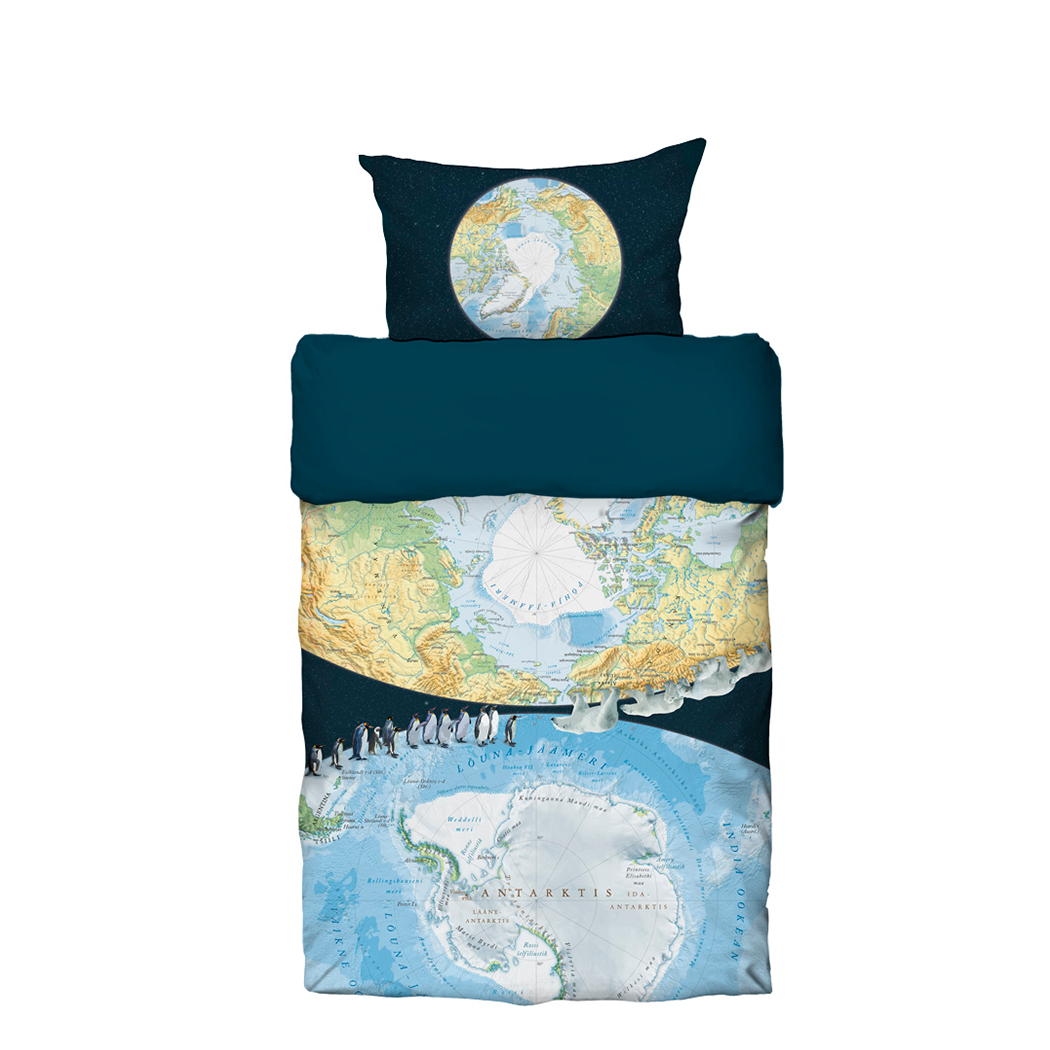 Toreda disainiga voodipesu Arktika ja Antarktika kaartidega, millel jalutavad pingviinid ja jääkarud. Komplekt: tekikott 150 x 210 cm ja 1 padjapüür 50 x 60 cm. Materjal: pehme ja mõnus puuvill-satiin (100 % puuvill), kangas ja värvid peavad pesule väga hästi vastu.