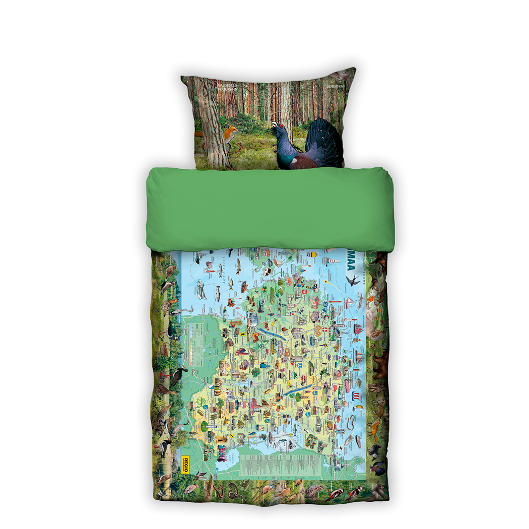 Tekikotil on rikkalikult illustreeritud Eestimaa piltkaart. Kaardil on kujutatud Eesti vaatamisväärsusi ja loodust, samuti inimeste igapäevaelu. Tekikoti servades on vahvad pildid Eestis elavatest loomadest ja lindudest. Komplekt: tekikott 150 x 210 cm ja 1 padjapüür 50 x 60 cm. Materjal: pehme ja mõnus puuvill-satiin (100 % puuvill), kangas ja värvid peavad pesule väga hästi vastu.