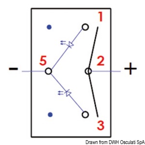 IP56 veekindel lüliti, Marina seeria. Paigaldamiseks on vaja 21,5 x 36,8 mm ristkülikukujulist ava. Maksimaalne võimsus 20 A 12 V juures ja 12 A 24 V juures. Komplektis kahe punase LED-iga: üks sümboli jaoks, mis on alati sisse lülitatud, teine sümboli all oleva spetsiaalse ava jaoks, mis lülitub sisse, kui sümboli indikaator aktiveeritakse. Külgklapp lüliti tuleb tellida eraldi.