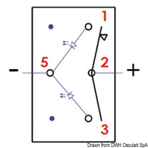 IP56 veekindel lüliti, Marina seeria. Paigaldamiseks on vaja 21,5 x 36,8 mm ristkülikukujulist ava. Maksimaalne võimsus 20 A 12 V juures ja 12 A 24 V juures. Komplektis kahe punase LED-iga: üks sümboli jaoks, mis on alati sisse lülitatud, teine sümboli all oleva spetsiaalse ava jaoks, mis lülitub sisse, kui sümboli indikaator aktiveeritakse. Külgklapp lüliti tuleb tellida eraldi.