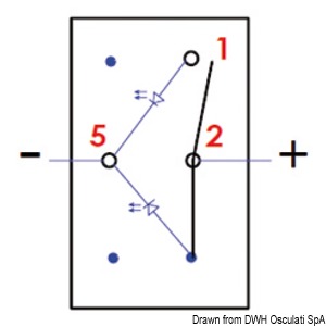IP56 veekindel lüliti, Marina seeria. Paigaldamiseks on vaja 21,5 x 36,8 mm ristkülikukujulist ava. Maksimaalne võimsus 20 A 12 V juures ja 12 A 24 V juures. Komplektis kahe punase LED-iga: üks sümboli jaoks, mis on alati sisse lülitatud, teine sümboli all oleva spetsiaalse ava jaoks, mis lülitub sisse, kui sümboli indikaator aktiveeritakse. Külgklapp lüliti tuleb tellida eraldi.