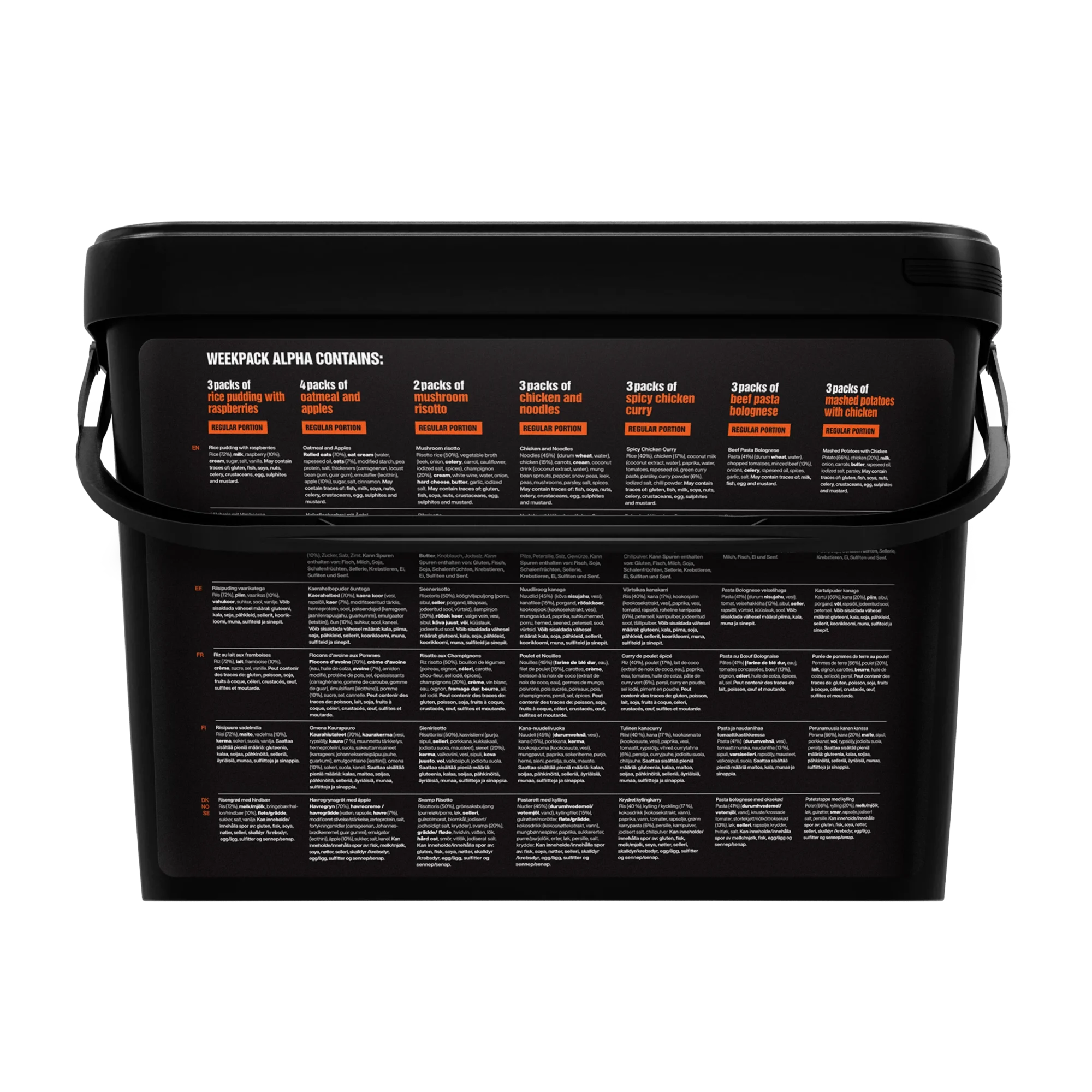 21 täisväärtuslikku matkatoitu. 100% külmkuivatatud, kerge kaaluga. Mõeldud ühele inimesele terveks nädalaks. Weekpack Alpha on meie kõigi aegade hitt. Seest leiad meie kõige populaarsemad road – ja alati komplektina 20% soodsam kui eraldi ostes. Sisaldab 21 toidupakki. Ehtsad maitsed, ehtsad koostisosad – ilma säilitusaineteta. Kokku 10 206 kcal, kaal vaid 3.5 kg. Valmis 10 minutiga. Säilib kuni 8 aastat, Pakendatud veekindlasse ämbrisse. Pakk sisaldab: 4x Kaerahelbepuder õuntega, 3x Riisipuding vaarikatega, 2x Seenerisoto, 3x Pasta Bolognese veiselihaga, 3x Kartulipuder kanaga, 3x Nuudliroog kanaga, 3x Vürtsikas kanakarri.